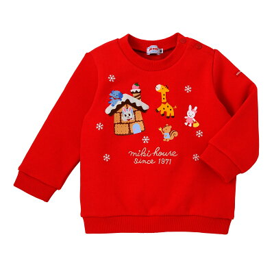 80-100cm 110-120cm商品説明 お菓子の家に集まる動物モチーフが可愛らしいトレーナーです。